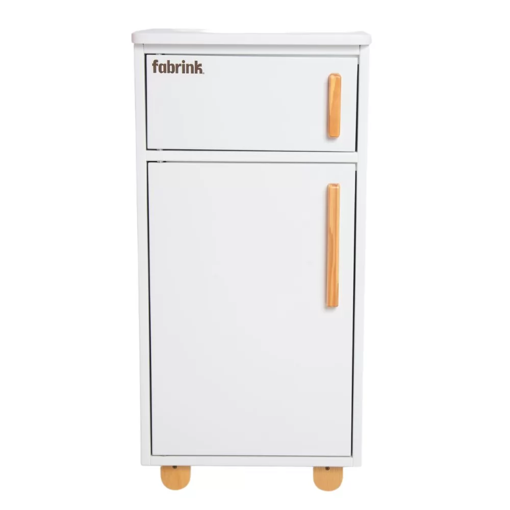 A Geladeira Infantil Branca de Madeira Fabrink traz um toque de pureza e elegância para o cantinho gourmet dos pequenos chefs! Seu tom branco clássico e design encantador são perfeitos para guardar "comidinhas" imaginárias, organizar potes ou até servir como armário de brinquedos.