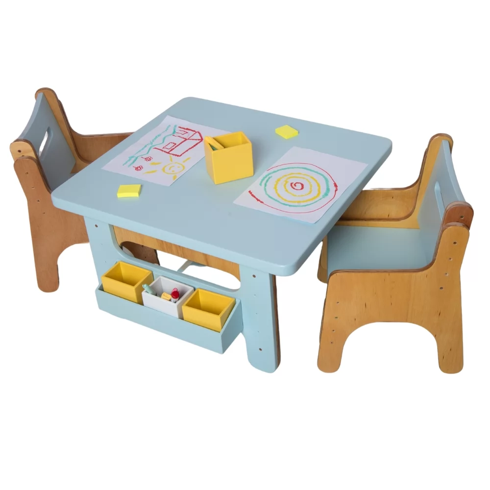 - Uma mesa infantil em madeira com acabamento em tinta à base de água.
